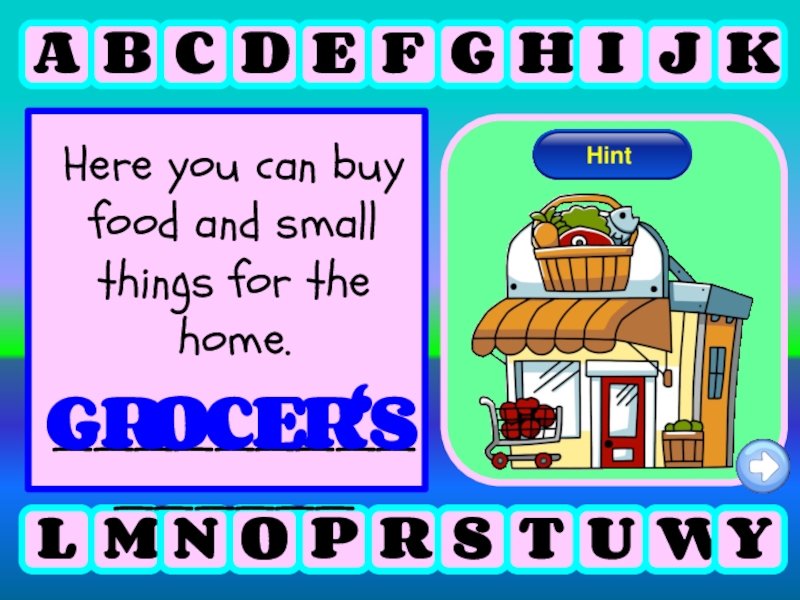 ABCDEFGHIJKLMNOPRSTUWYHere you can buy food and small things for the home._______________GROCERS‘