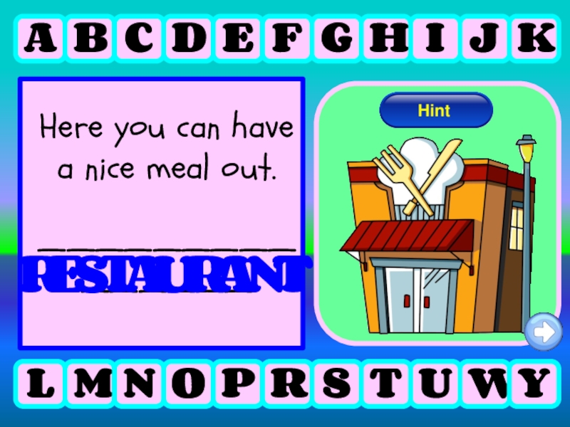 ABCDEFGHIJKLMNOPRSTUWYHere you can have a nice meal out._______________RESTAURNTA