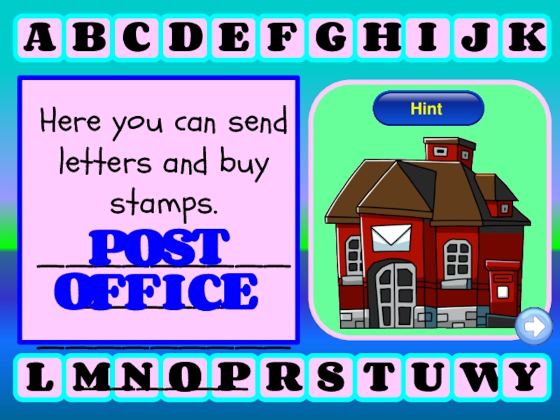 ABCDEFGHIJKLMNOPRSTUWYHere you can send letters and buy stamps.______________________________PSTOOFFICE