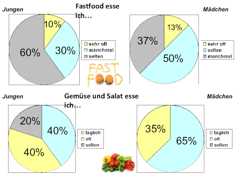 JungenMädchenJungenMädchenFastfood esse ich…Gemüse und Salat esse ich…60%10%30%50%37%13%20%40%40%35%65%