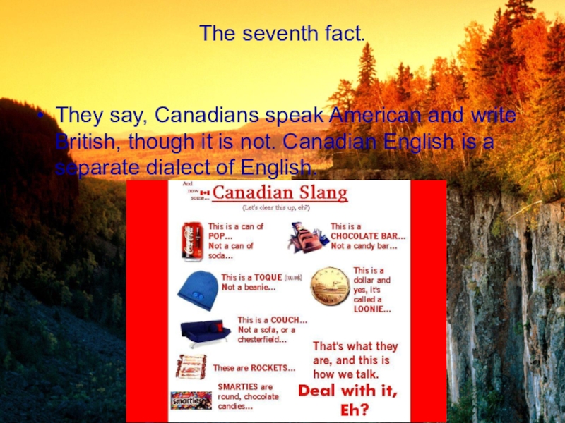 The seventh fact. They say, Canadians speak American and write British, though it is not. Canadian English