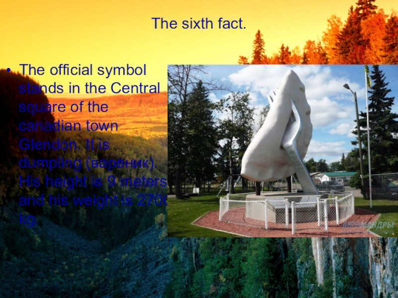 The sixth fact. The official symbol stands in the Central square of the canadian town Glendon. It