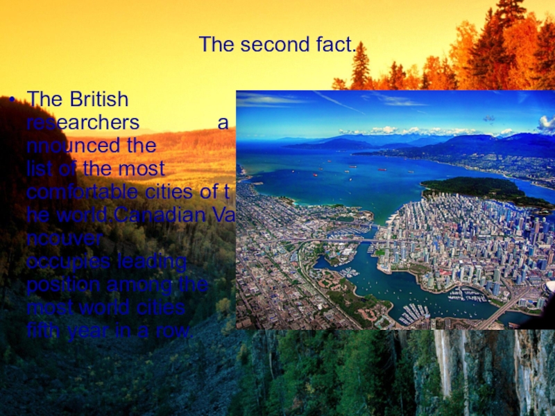 The second fact. The British researchers       announced the list of the most comfortable cities of the world.Canadian Vancouver occupies leading   position among the