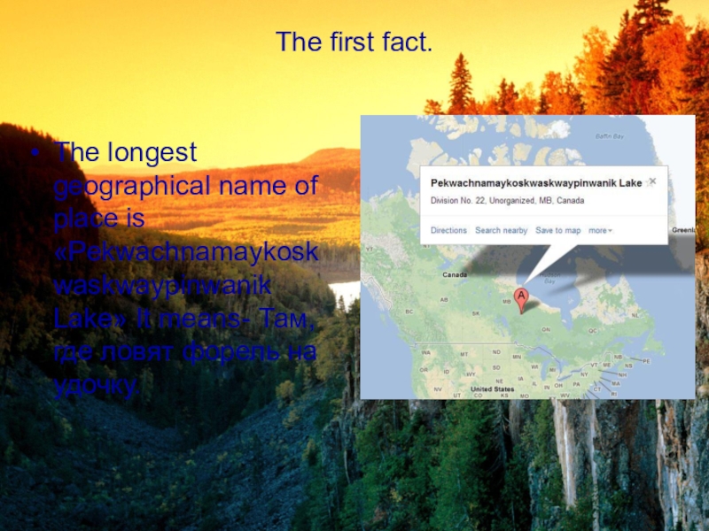 The first fact. The longest geographical name of place is «Pekwachnamaykoskwaskwaypinwanik Lake» It means- Там, где ловят форель на удочку.