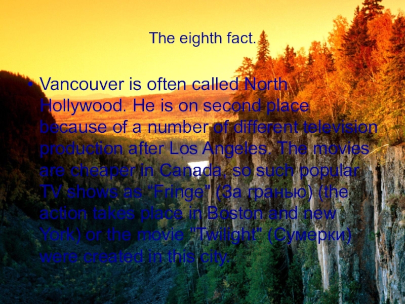 The eighth fact. Vancouver is often called North Hollywood. He is on second place because of a