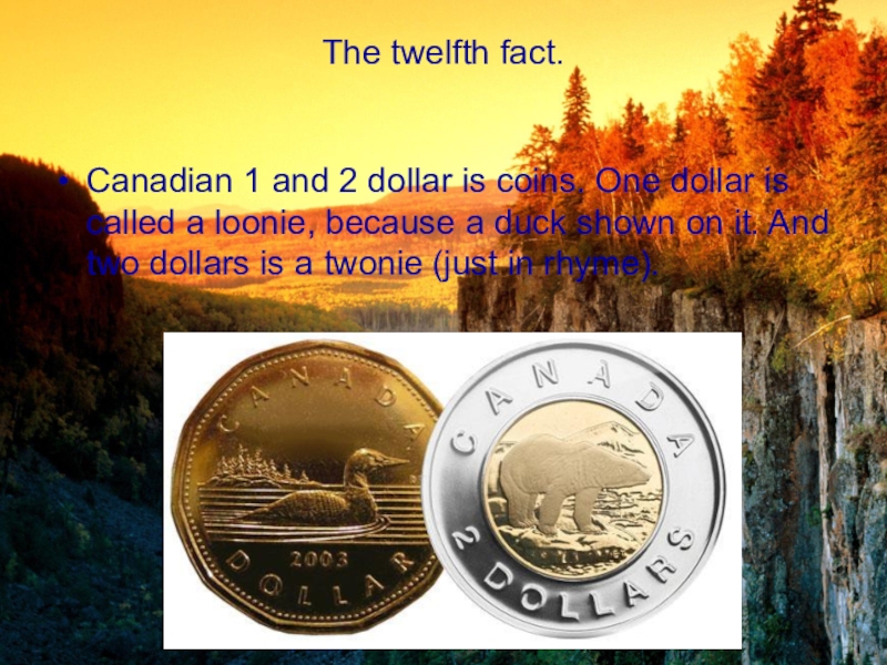 The twelfth fact.Canadian 1 and 2 dollar is coins. One dollar is called a loonie, because a