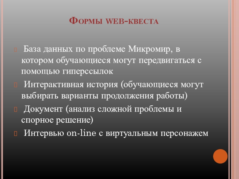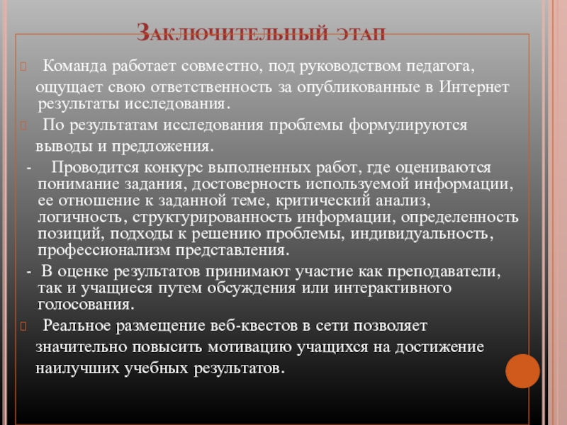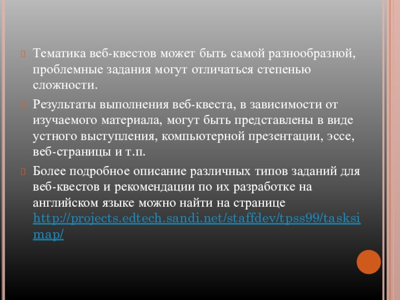 Результаты выполнения веб-квеста, в зависимости от изучаемого материала, могут быть представлены в виде устного выступления, компьютерной презентации, эссе, веб-страницы и т.п.