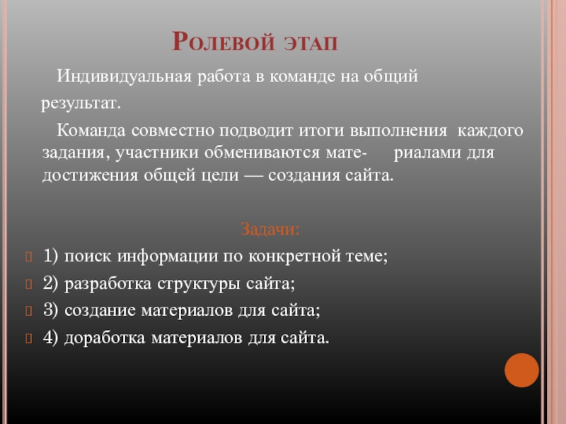 Команда совместно подводит итоги выполнения каждого задания, участники обмениваются мате- риалами для достижения общей цели — создания сайта.