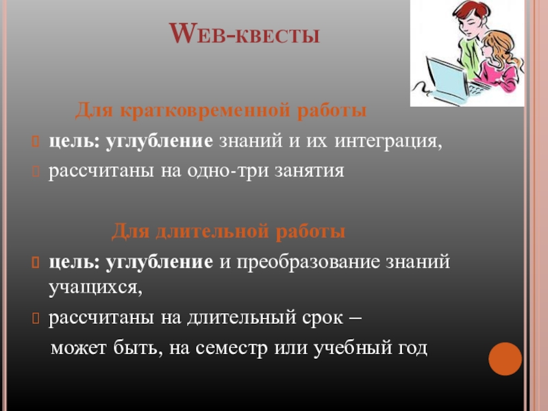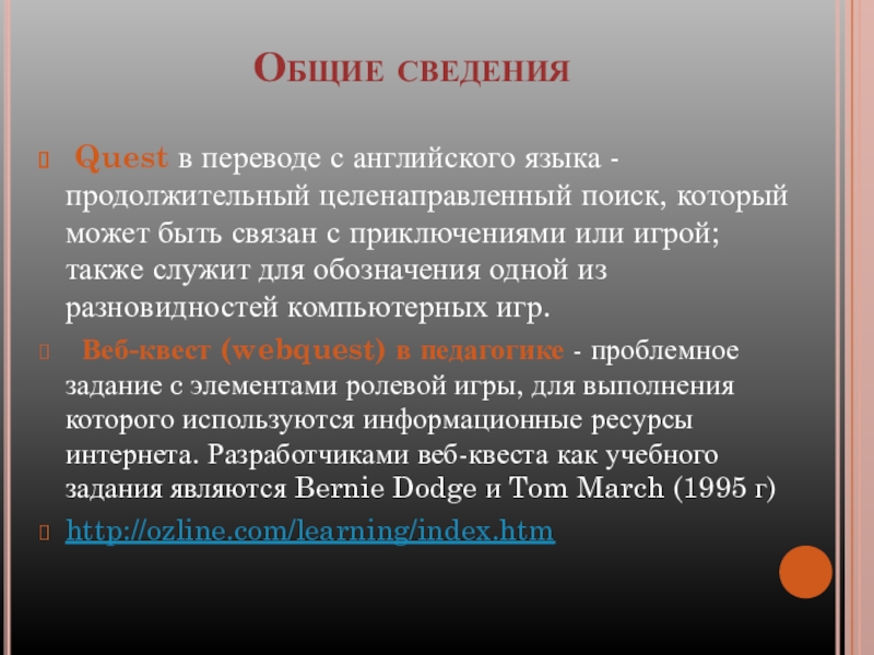 Веб-квест (webquest) в педагогике - проблемное задание c элементами ролевой игры, для выполнения которого используются информационные ресурсы интернета. Разработчиками веб-квеста как учебного задания являются Bernie Dodge и Tom March (1995 г)