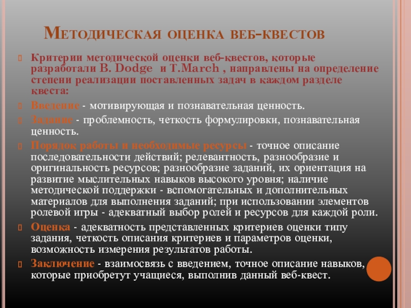 Dodge и Т.March , направлены на определение степени реализации поставленных задач в каждом разделе квеста: