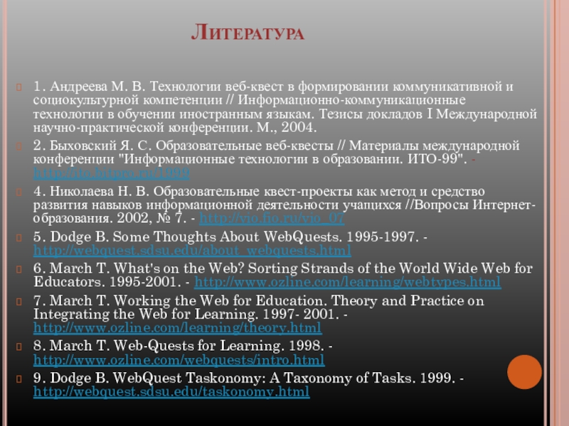 1. Андреева М. В. Технологии веб-квест в формировании коммуникативной и социокультурной компетенции // Информационно-коммуникационные технологии в обучении иностранным языкам. Тезисы докладов I Международной научно-практической конференции. М., 2004.