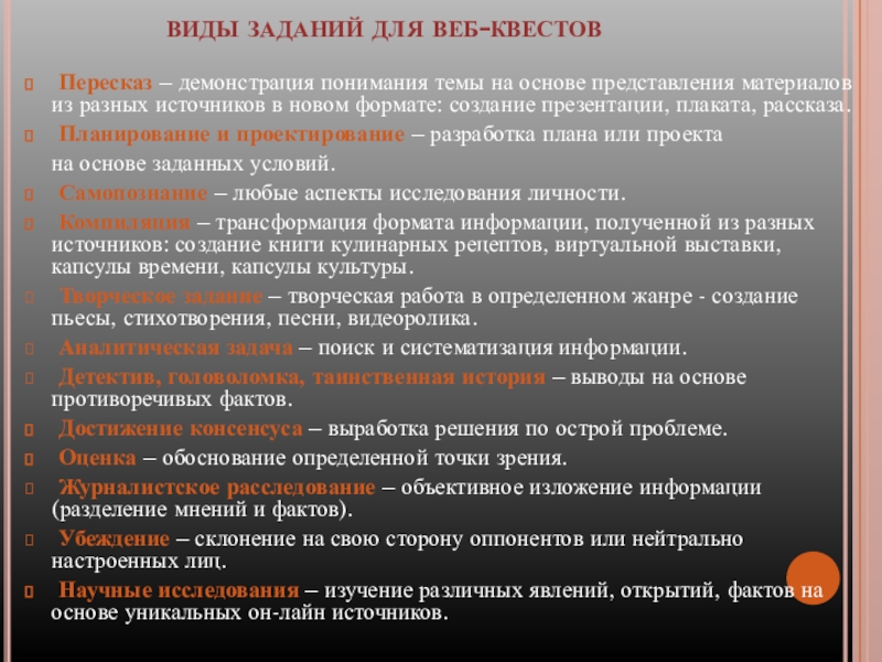 Более подробное описание различных типов заданий для веб-квестов и рекомендации по их разработке на английском языке можно найти на странице http://projects.edtech.sandi.net/staffdev/tpss99/tasksimap/
