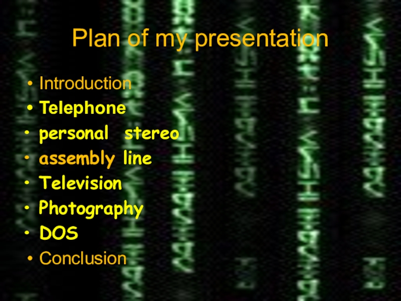 Plan of my presentationIntroductionTelephonepersonal stereo assembly lineTelevisionPhotographyDOSConclusion
