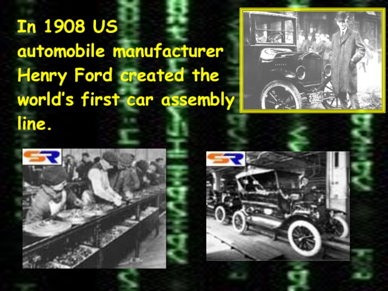 In 1908 USautomobile manufacturerHenry Ford created theworld’s first car assemblyline.