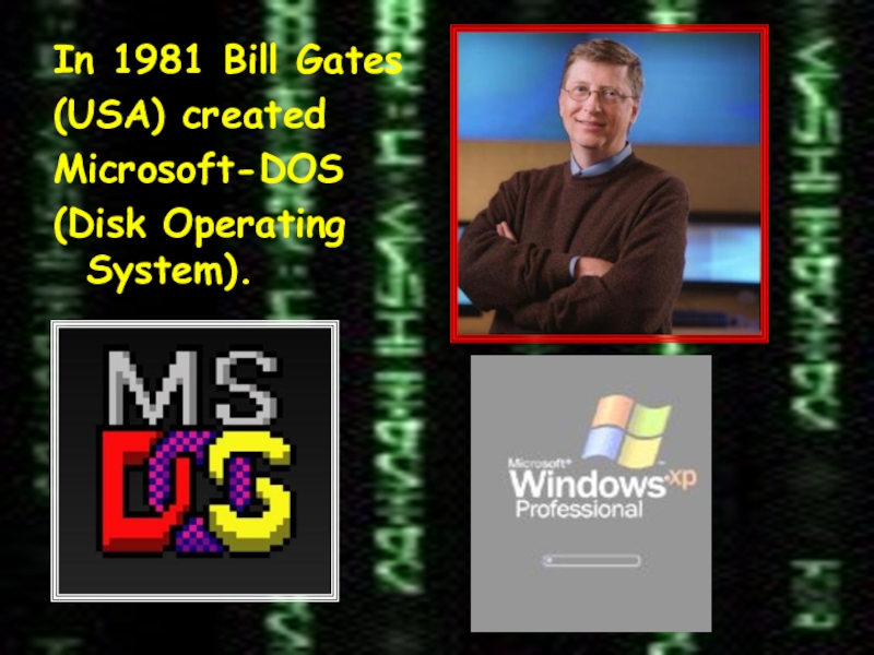 In 1981 Bill Gates(USA) createdMicrosoft-DOS(Disk Operating System).