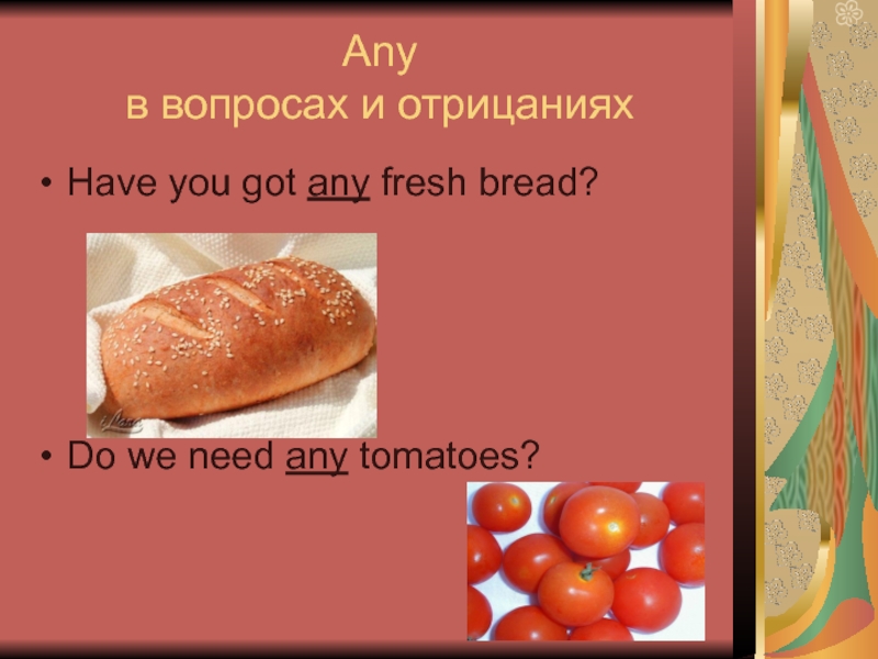 Any в вопросах и отрицанияхHave you got any fresh bread?Do we need any tomatoes?