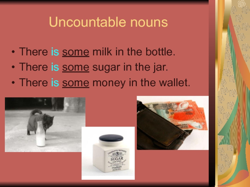 Uncountable nounsThere is some milk in the bottle.There is some sugar in the jar.There is some money