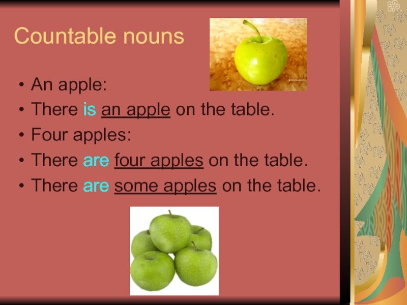 Countable nounsAn apple:There is an apple on the table.Four apples:There are four apples on the table.There are some apples on the table.