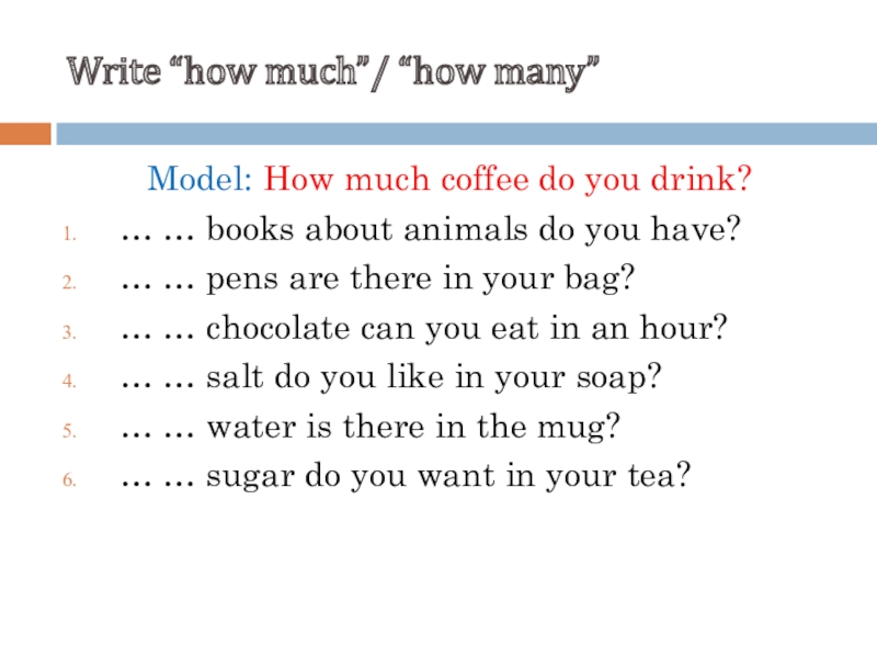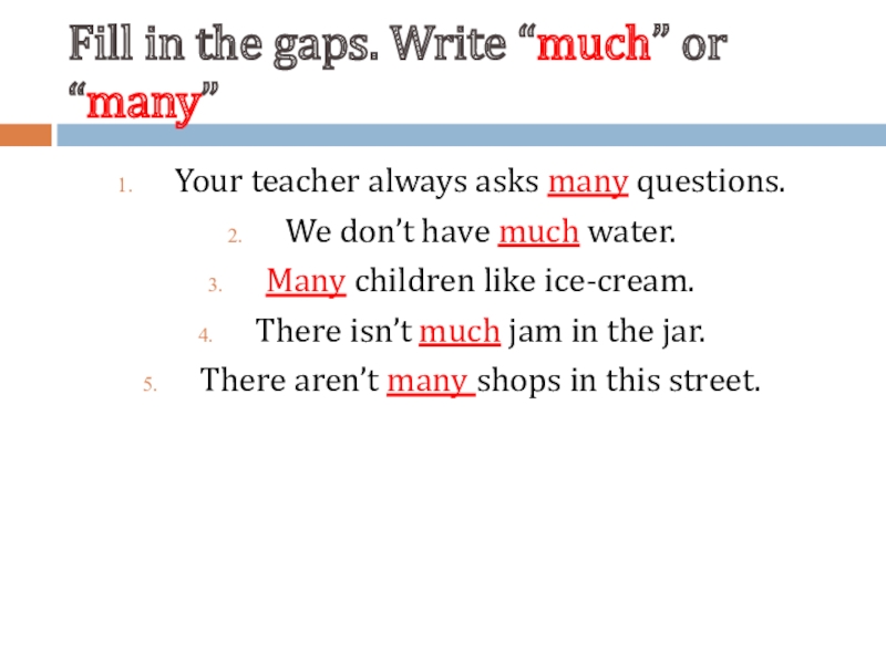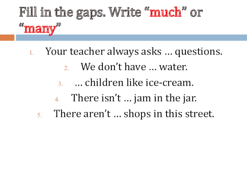 Слайд 20Fill in the gaps. Write “much” or “many”
