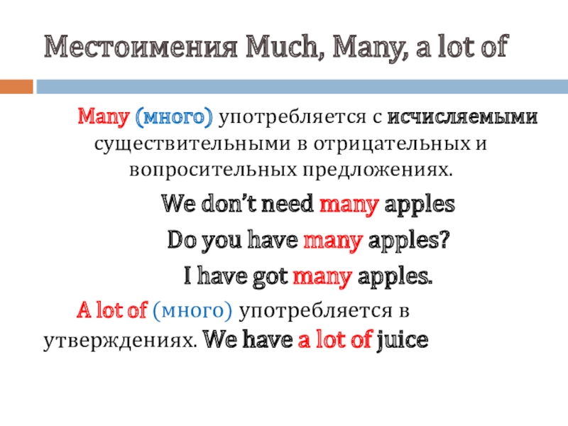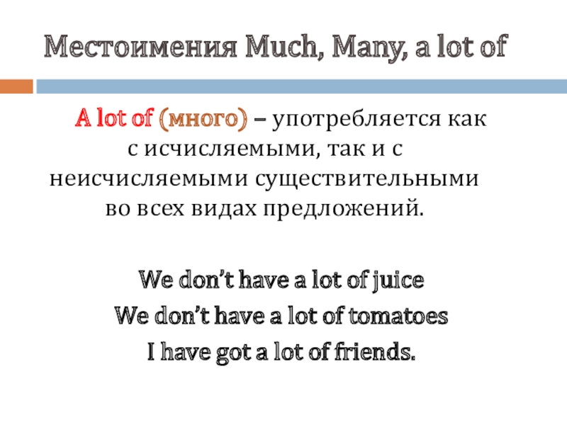 A lot of (много) употребляется в утверждениях. We have a lot of juice