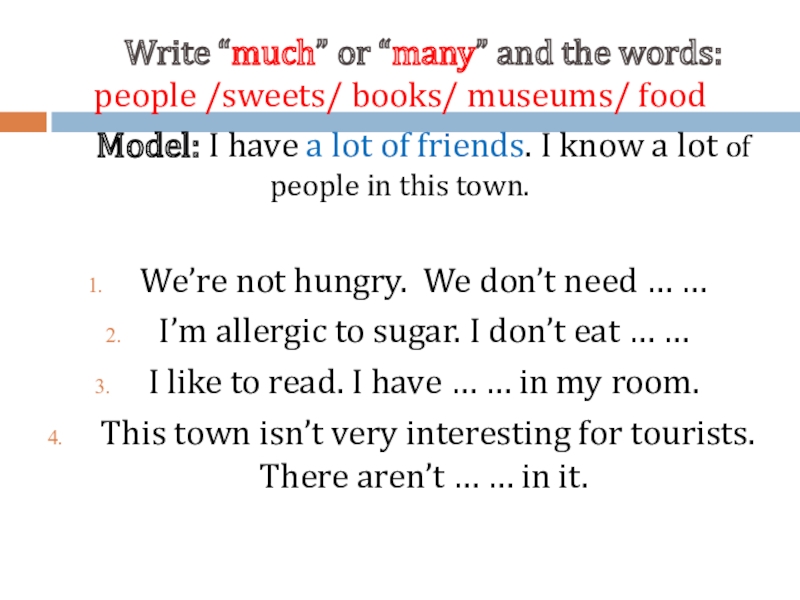 Слайд 22Write “much” or “many” and the words: people /sweets/ books/ museums/