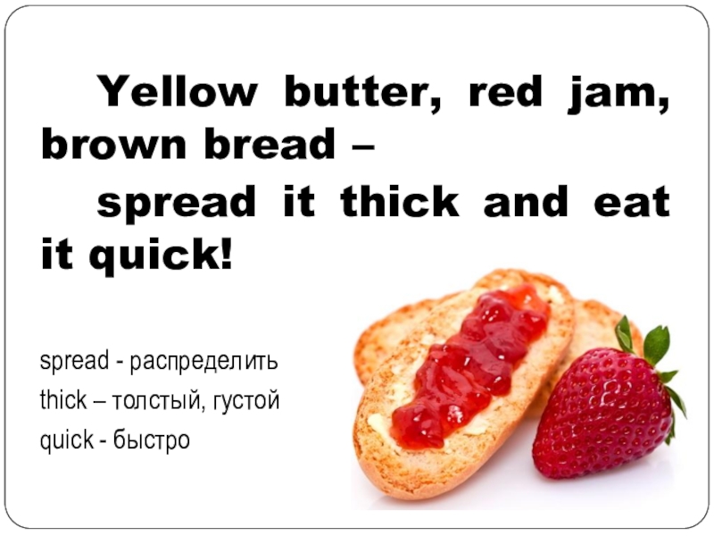 Yellow butter, red jam, brown bread –spread it thick and eat it quick!spread - распределитьthick – толстый, густойquick - быстро