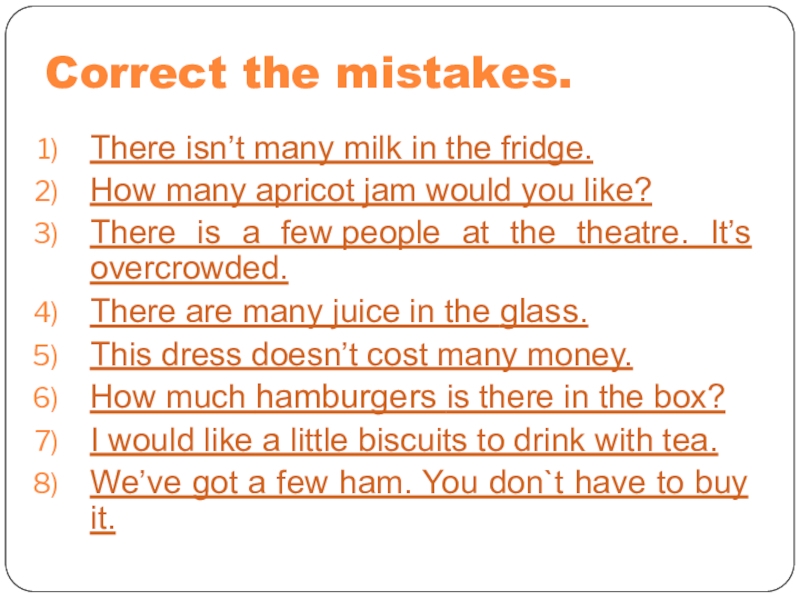 Correct the mistakes.There isn’t many milk in the fridge.How many apricot jam would you like?There is a