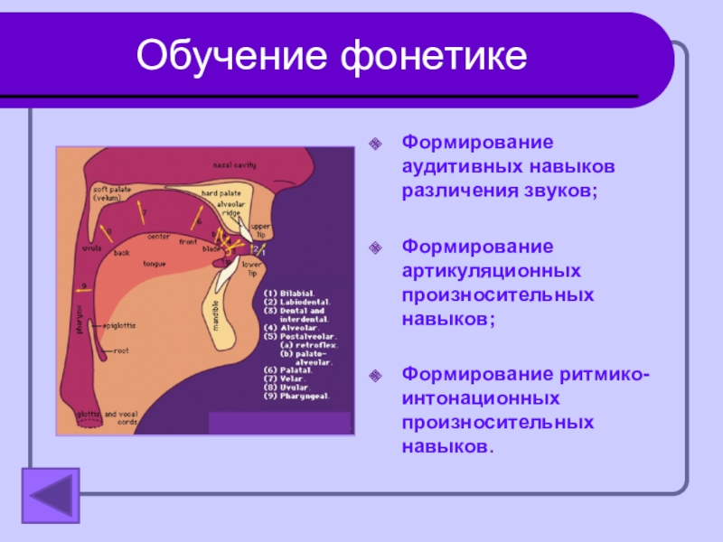Обучение фонетикеФормирование аудитивных навыков различения звуков;Формирование артикуляционных произносительных навыков;Формирование ритмико-интонационных произносительных навыков.