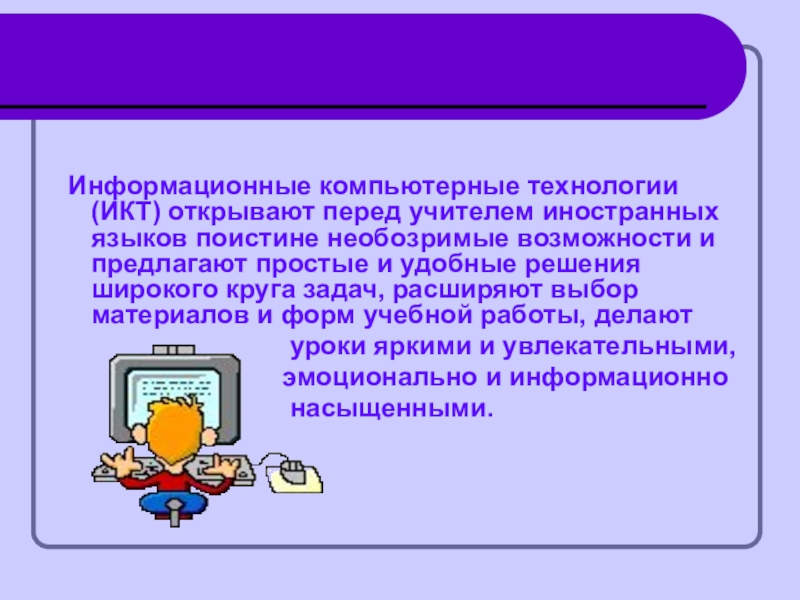 Информационные компьютерные технологии (ИКТ) открывают перед учителем иностранных языков поистине необозримые возможности и предлагают простые и