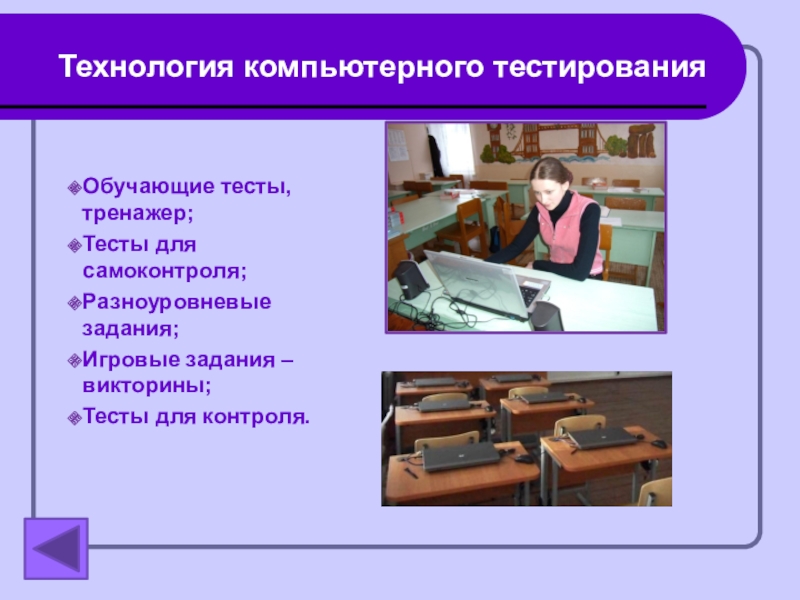 Технология компьютерного тестированияОбучающие тесты,    тренажер;Тесты для  самоконтроля;Разноуровневые задания;Игровые задания – викторины;Тесты для контроля.