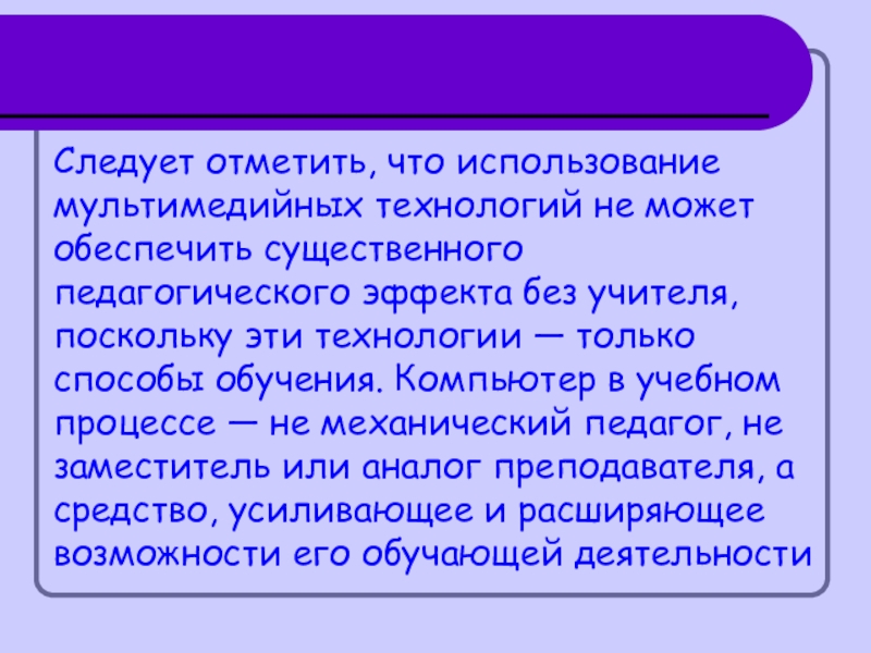 Следует отметить, что использование мультимедийных технологий не может обеспечить существенного педагогического эффекта без учителя, поскольку эти технологии —
