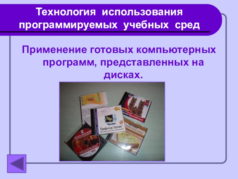 Технология использования программируемых учебных средПрименение готовых компьютерных программ, представленных на дисках.