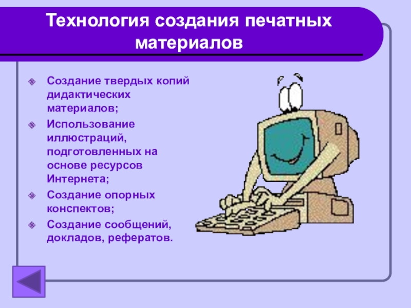 Технология создания печатных материаловСоздание твердых копий дидактических материалов;Использование иллюстраций, подготовленных на основе ресурсов Интернета;Создание опорных конспектов;Создание сообщений,