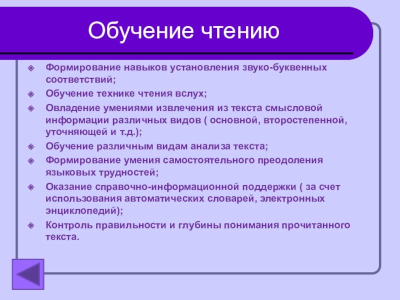 Обучение технике чтения вслух;