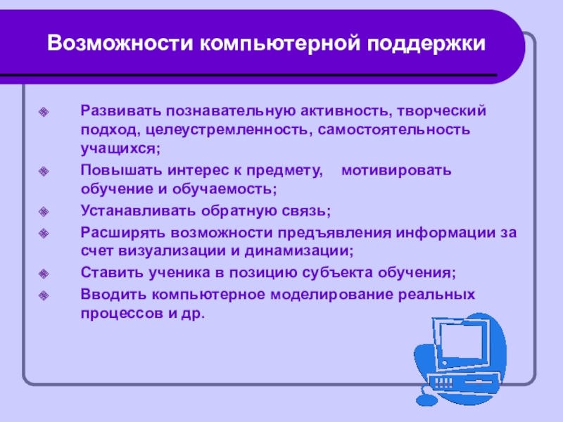 Возможности компьютерной поддержкиРазвивать познавательную активность, творческий подход, целеустремленность, самостоятельность учащихся;Повышать интерес к предмету,  мотивировать обучение и