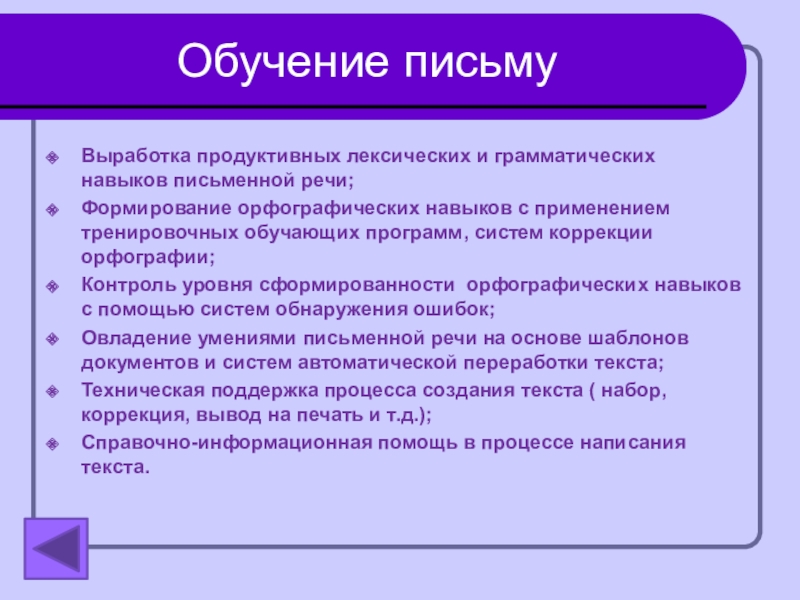 Обучение письмуВыработка продуктивных лексических и грамматических навыков письменной речи;Формирование орфографических навыков с применением тренировочных обучающих программ, систем