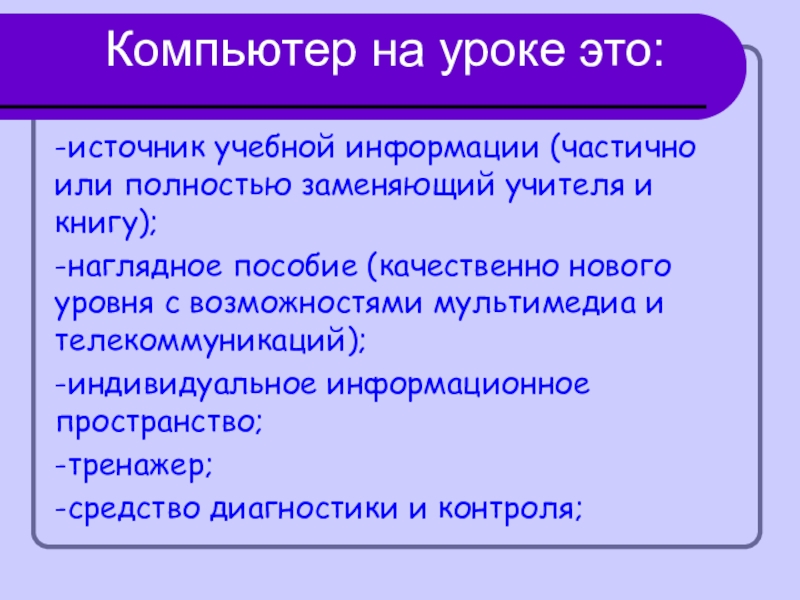 Компьютер на уроке это: -источник учебной информации (частично или полностью заменяющий учителя и книгу); -наглядное пособие (качественно