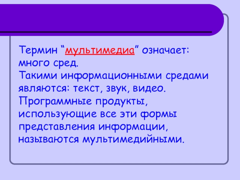Термин “мультимедиа” означает: много сред.  Такими информационными средами являются: текст, звук, видео. Программные продукты, использующие все