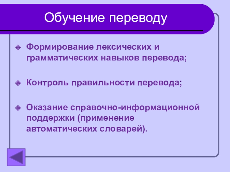Обучение переводуФормирование лексических и грамматических навыков перевода;Контроль правильности перевода;Оказание справочно-информационной поддержки (применение автоматических словарей).