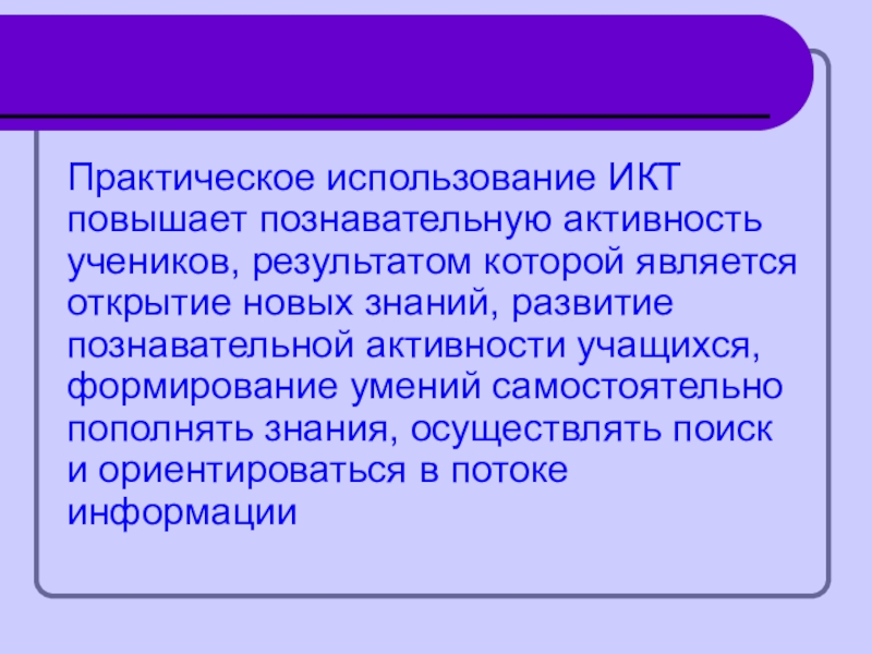 Практическое использование ИКТ повышает познавательную активность учеников, результатом которой является открытие новых знаний, развитие познавательной активности учащихся,