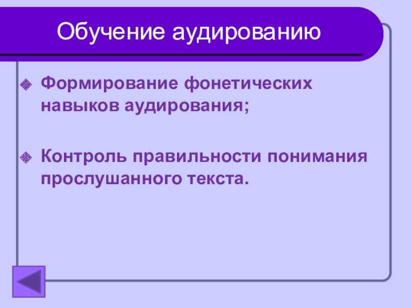 Обучение аудированиюФормирование фонетических навыков аудирования;Контроль правильности понимания прослушанного текста.