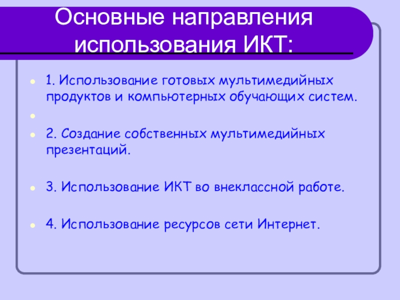 Основные направления использования ИКТ:1. Использование готовых мультимедийных продуктов и компьютерных обучающих систем. 2. Создание собственных мультимедийных презентаций.