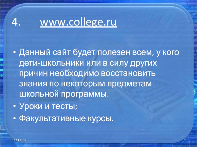 4.    www.college.ruДанный сайт будет полезен всем, у кого дети-школьники или в силу других причин