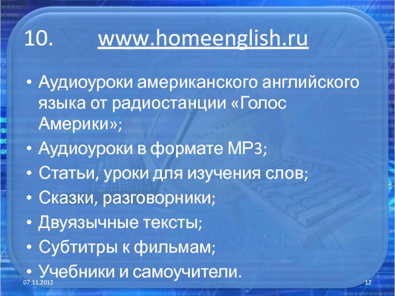 10.    www.homeenglish.ruАудиоуроки американского английского языка от радиостанции «Голос Америки»;Аудиоуроки в формате МР3;Статьи, уроки для
