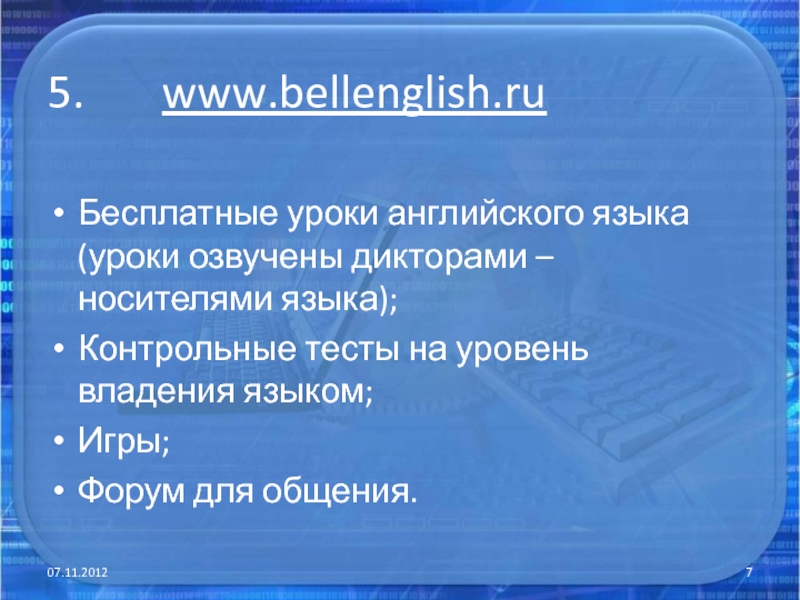 5.    www.bellenglish.ruБесплатные уроки английского языка (уроки озвучены дикторами – носителями языка);Контрольные тесты на уровень