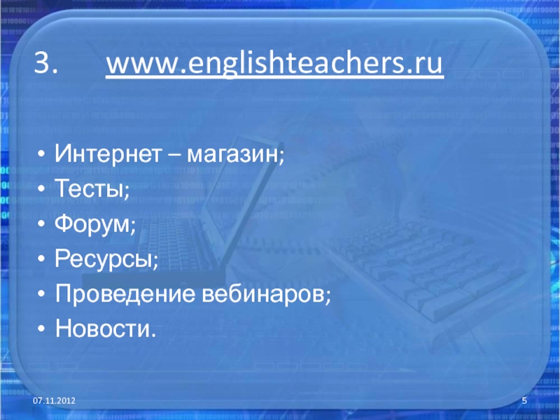 3.   www.englishteachers.ruИнтернет – магазин;Тесты;Форум;Ресурсы;Проведение вебинаров;Новости.