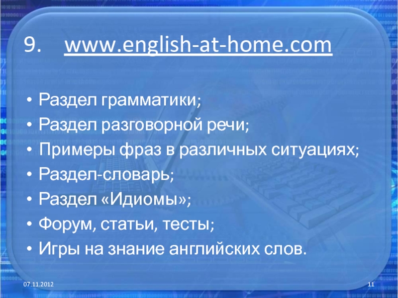 9.  www.english-at-home.comРаздел грамматики;Раздел разговорной речи;Примеры фраз в различных ситуациях;Раздел-словарь;Раздел «Идиомы»;Форум, статьи, тесты;Игры на знание английских слов.