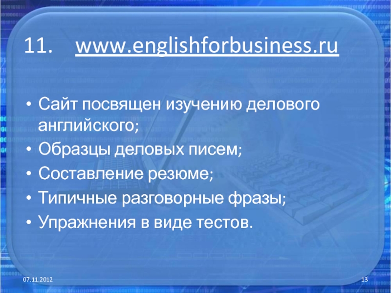 11.  www.englishforbusiness.ruСайт посвящен изучению делового английского;Образцы деловых писем;Составление резюме;Типичные разговорные фразы;Упражнения в виде тестов.
