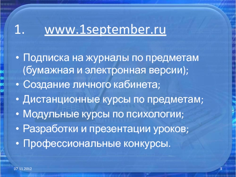 1.   www.1september.ruПодписка на журналы по предметам (бумажная и электронная версии);Создание личного кабинета;Дистанционные курсы по предметам;Модульные