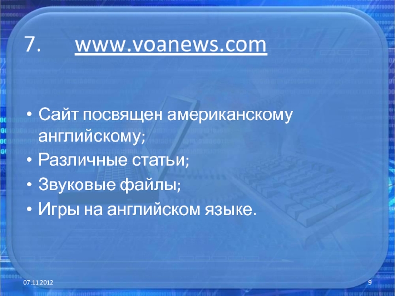 7.   www.voanews.comСайт посвящен американскому английскому;Различные статьи;Звуковые файлы;Игры на английском языке.